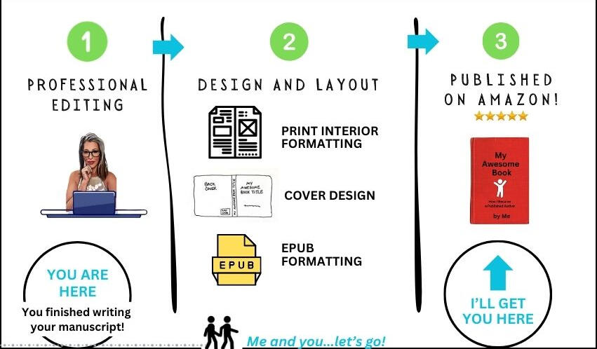 Being a creative gal, I love to take that fine-tuned manuscript and turn it into lovely, eye-pleasing pages. You'll walk away with three files—print book interior, print cover, and flowable ePub file—that you can upload online.
